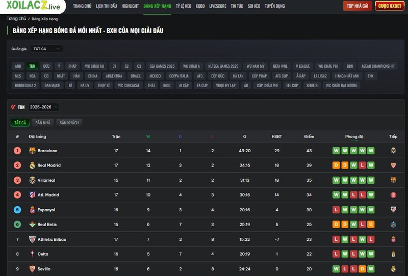 Bên cạnh đó, Xoilac cũng bao phủ đầy đủ các giải đấu lớn nhỏ. Từ Ngoại hạng Anh, Champions League cho đến La Liga, Serie A, Bundesliga và các giải đội tuyển, châu Á, anh em đều có thể tìm thấy dễ dàng. Riêng với những ai yêu La Liga, việc vừa xem Real Madrid hay Barcelona thi đấu, vừa kiểm tra thứ hạng của họ ngay trên cùng nền tảng mang lại sự tiện lợi rất rõ rệt.